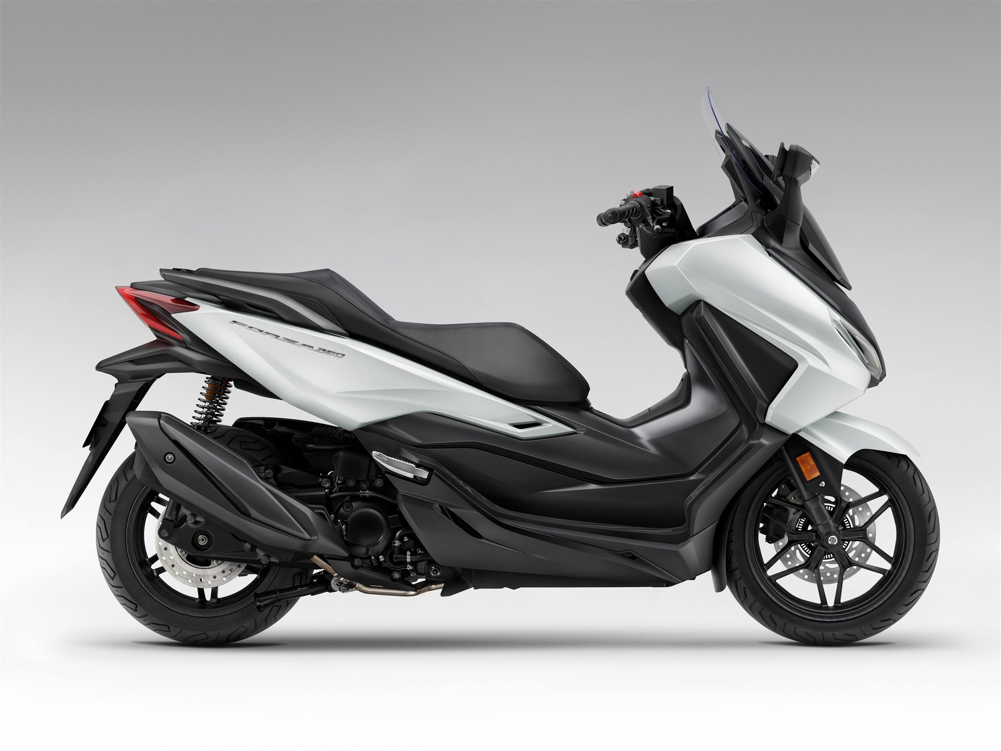Der Forza 350 überzeugt mit schlankem, aerodynamisch effizientem Design. Für zusätzlichen Komfort sorgt die elektrisch verstellbare Windschutzscheibe, die die Wahl zwischen ungehinderter Sicht oder maximalem Windschutz erlaubt. Die Frontpartie verleiht dem Fahrzeug eine elegante und raffinierte Identität. Die LED-Scheinwerfer werten Auftritt und Ausstrahlung markant auf. Das fahrstabile Chassis aus robustem Stahlrohrrahmen,