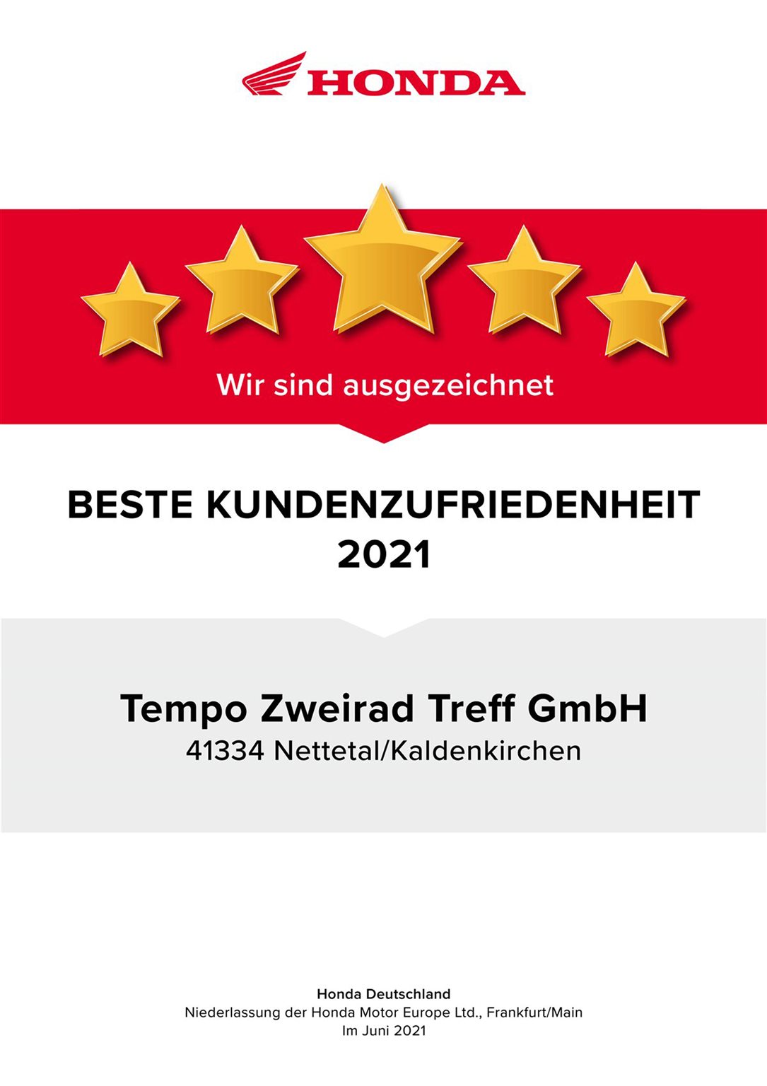 Mit Stolz nahmen wir heute diese Urkunde von Honda-Deutschland entgegen.